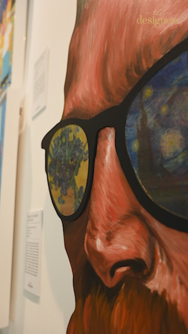 In the evocative masterpiece “A Visionary,” the iconic self-portrait of Vincent van Gogh takes on a contemporary twist. The artist’s self-assured gaze is intensified by a pair of sunglasses, eachlens a miniature canvas showcasing some of his most beloved masterpieces. One lens captures the swirling vibrancy of “Starry Night,” the bold strokes of paint seeming to dance across the glass, mirroring the sky’s luminous tumult, while “Cafe Terrace at Night” bathes in warm, inviting tones, and “AlmondBlossom” emerges with it’s delicate beauty. The enchanting sunflowers from “Sunflowers” bloom in intricate detail, their vivid colors a testament to Van Gogh’s exceptional ability to evoke motion through paint.