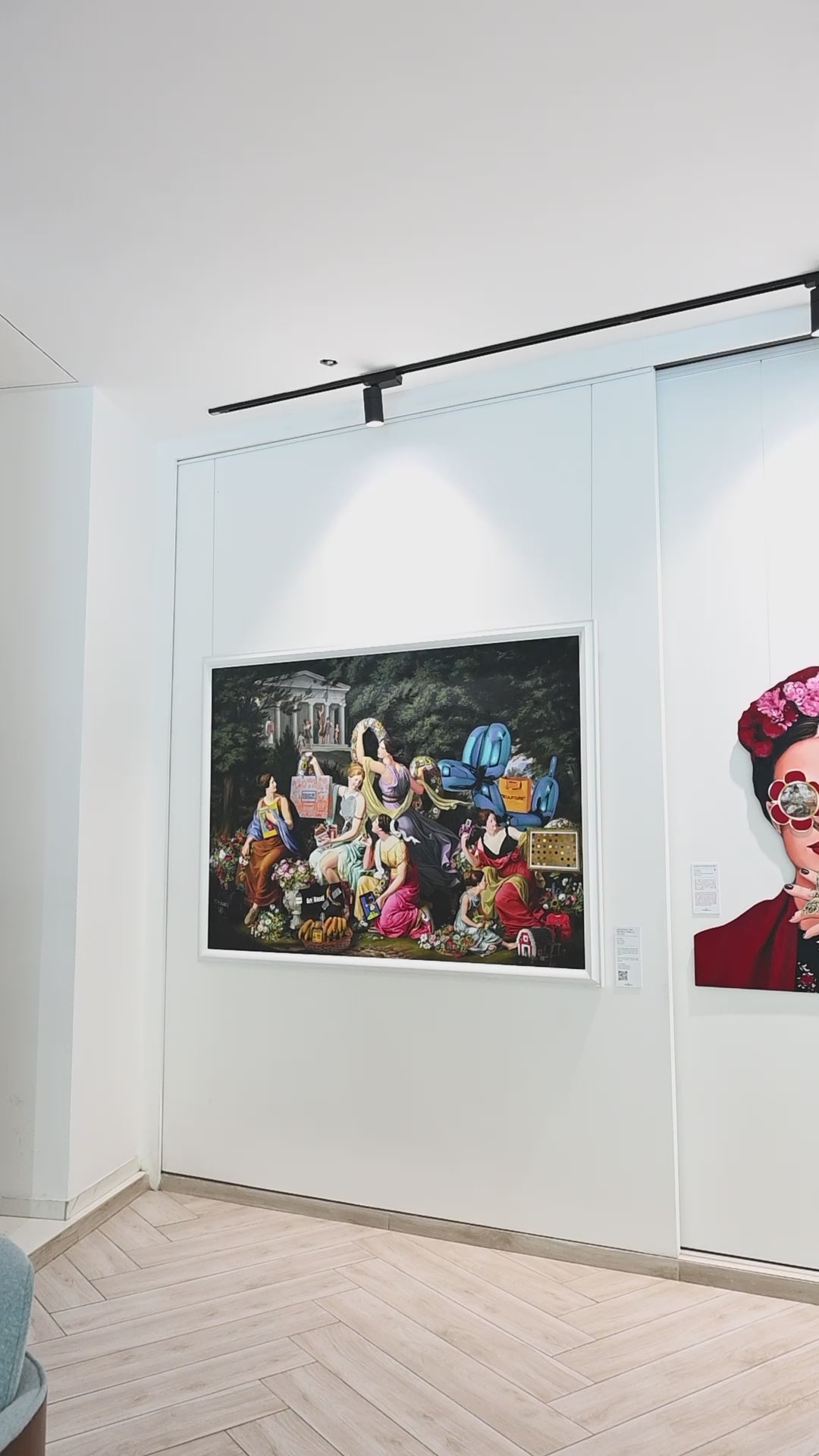 The iconic style of juxtaposing art history & contemporary fashion takes another step in its evolution with pop art taking an active role within the painting.In this painting, Maegha recreates the painting “Women Braiding Wreaths” by Heinrich Anton Dahling as if they are comparing their recent shopping triumphs and their coveted pop art collections.